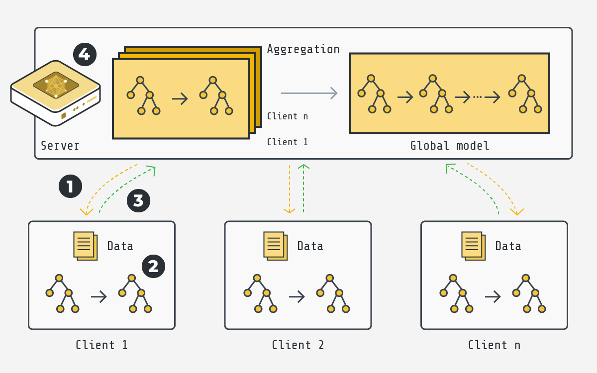- The server aggregates the received clients' trees to generate a new global model (tree ensemble). The new global model will be transmitted to clients in the next round.