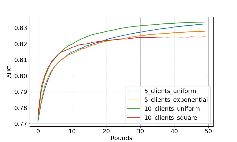 The example available on GitHub runs federated XGBoost training on HIGGS dataset. One can specify experimental setups via Flower Datasets, with varying numbers of clients and a range of client data distributions, including uniform, linear, square, and exponential. The figure above shows the tested AUC performance over FL rounds on 4 settings. One can see that all settings obtain stable performance boost over FL rounds (especially noticeable at the start of training). As expected, uniform setup shows higher AUC values (beyond 83% at the end) than square/exponential distribution.