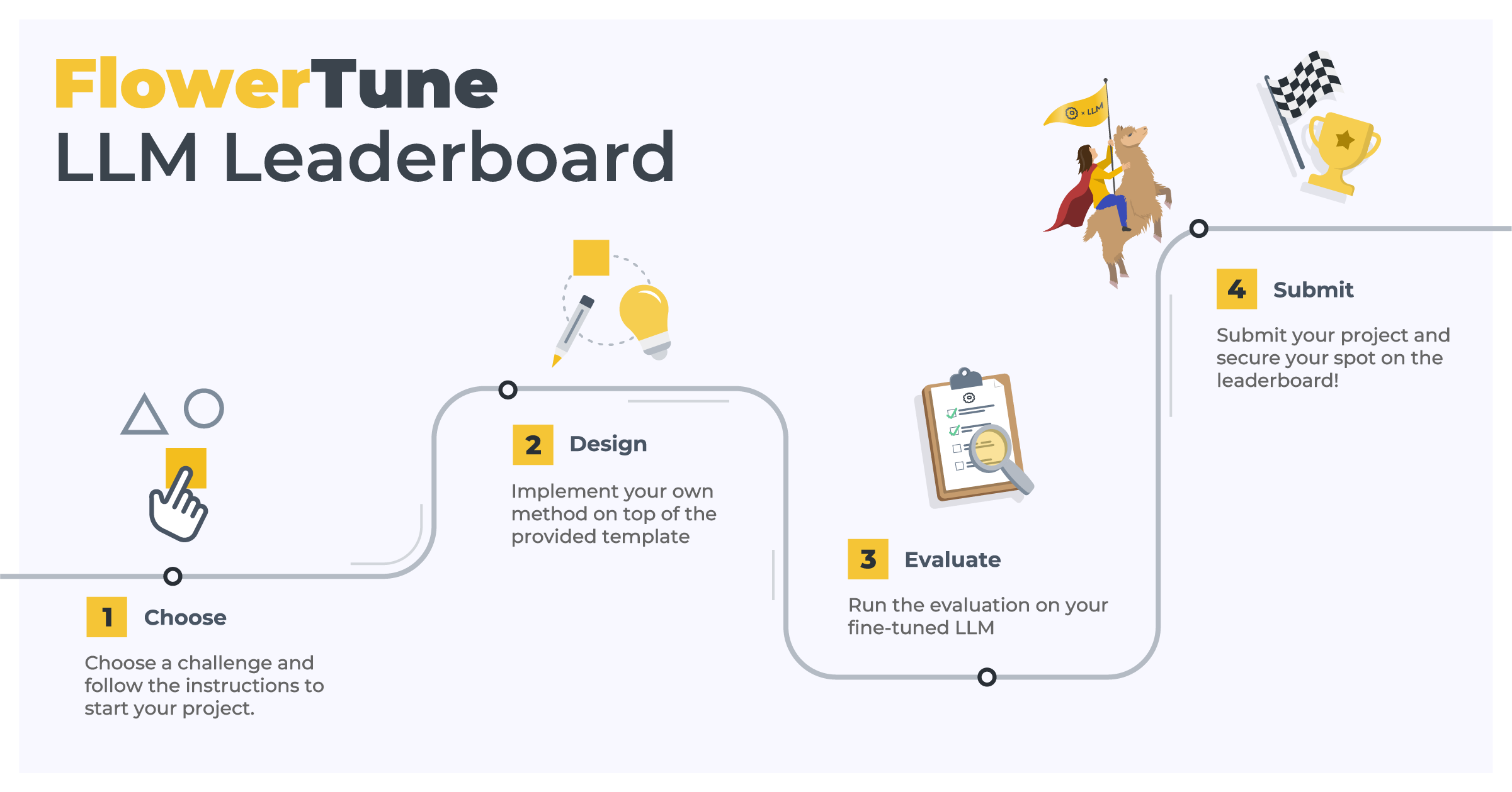 TL;DR: We are excited to launch the FlowerTune LLM Leaderboard ! π In this initiative, we provide a complete pipeline for the federated fine-tuning a pre-trained Mistral-7B across 4 tasks with model performance measured against a suitable baseline. Feel free to explore your own methods β tweak the hyperparameters, switch models, or try different FL algorithms β that perform this same fine-tuning process β only better! We invite you to submit your project, secure your spot on the leaderboard, and showcase your expertise in advancing the capabilities of federated LLM fine-tuning! Check all the details on our website: flower.ai/benchmarks/llm-leaderboard.