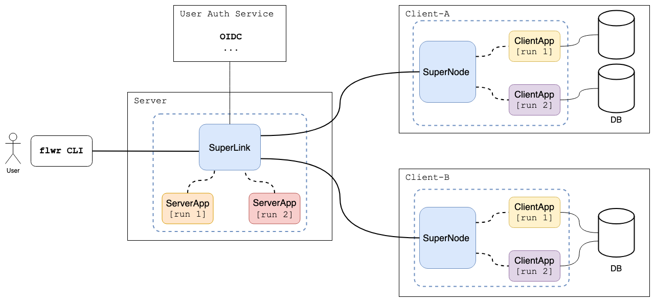 As described in the Vana data access layer, the federated learning workload can be triggered from the Flower CLI acting as the “Application Builder”. The Data Retrieval component of the Vana network retrieves the appropriate aggregation server and the corresponding clients for the given application. The application builder never directly interacts with the clients in the Flower architecture (shown below), which aligns well with Vana’s data access principle. This setup could also be made manually, wherein the application builder requests the compute engine to set up an aggregation server with requests to the required DataDAOs. The DataDAOs could then join the federation network by accepting invitations from the aggregation server.