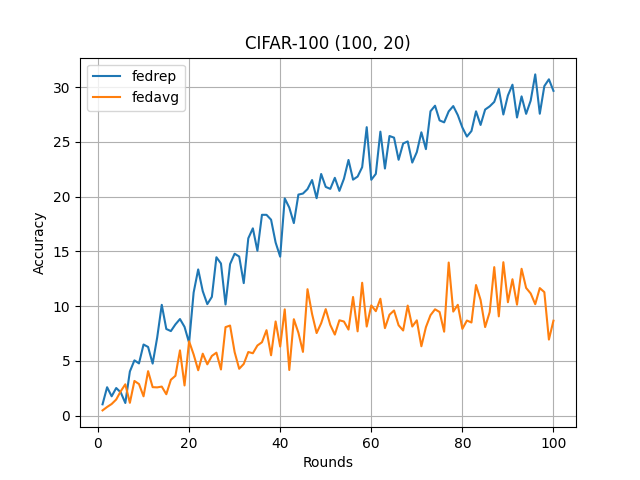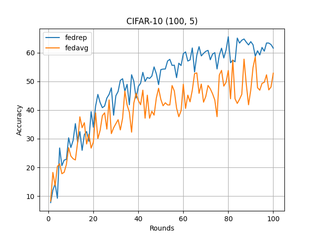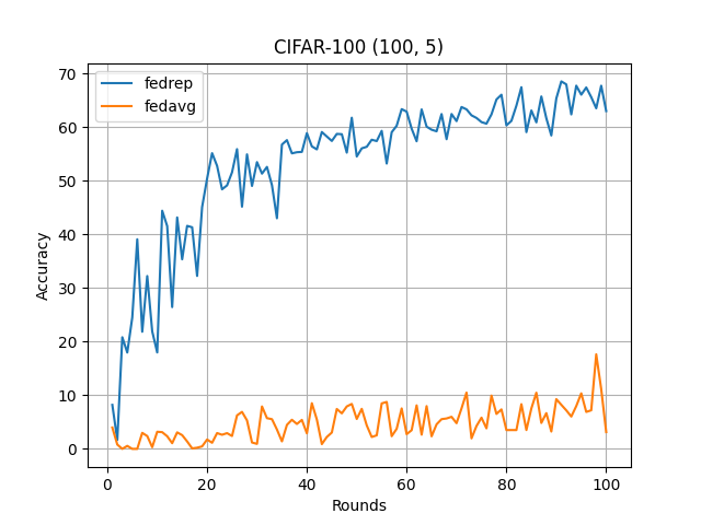 What’s implemented: The code in this directory replicates the experiments in Exploiting Shared Representations for Personalized Federated Learning (Liam Collins et al., 2021) for CIFAR10 and CIFAR-100 datasets, which proposed the FedRep model. Specifically, it replicates the results of CIFAR-10 ((100, 2), (100, 5)) and CIFAR-100 ((100, 5), (100, 20)) found in table 1 in their paper.