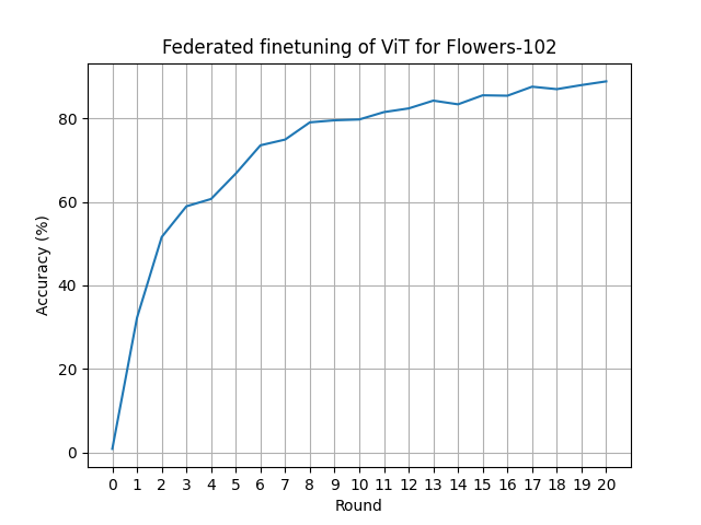 This example shows how to use Flower’s Simulation Engine to federate the finetuning of a Vision Transformer (ViT-Base-16) that has been pretrained on ImageNet. To keep things simple we’ll be finetuning it to Oxford Flower-102 datasset, creating 20 partitions using Flower Datasets. We’ll be finetuning just the exit head of the ViT, this means that the training is not that costly and each client requires just ~1GB of VRAM (for a batch size of 32 images) if you choose to use a GPU.